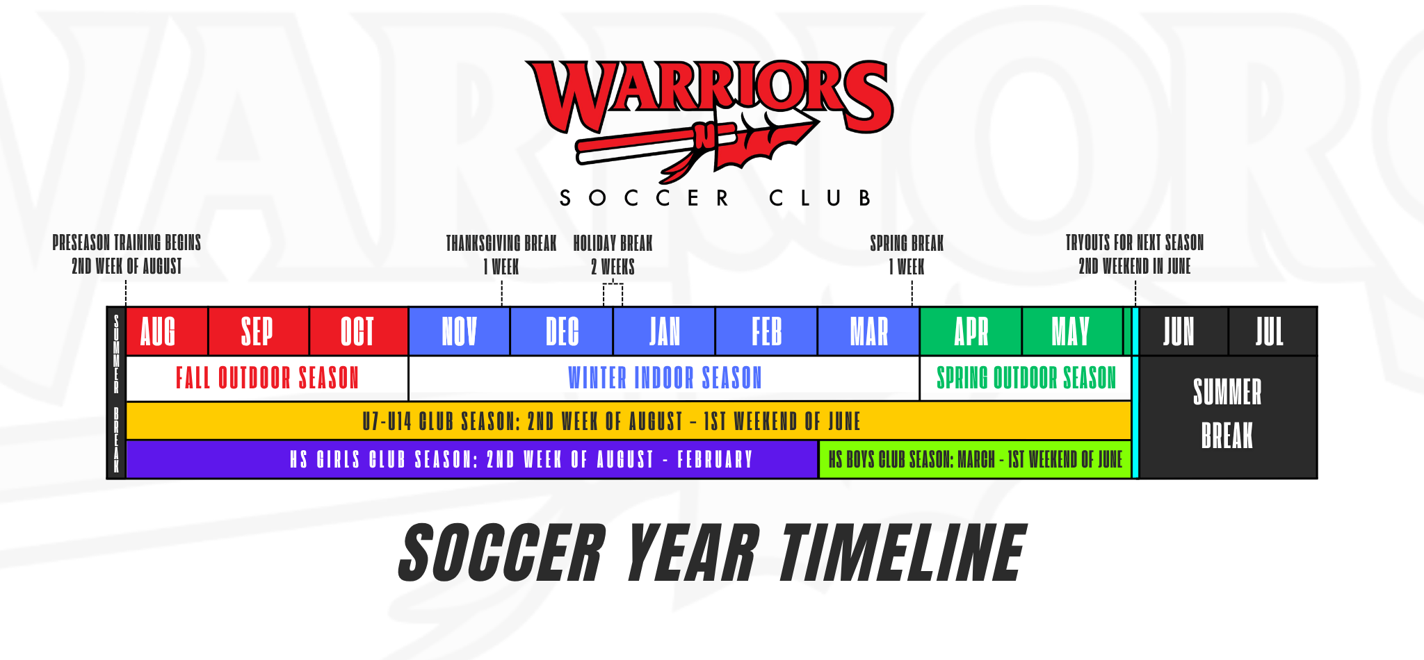 For players U14 and younger, the season will run from August 2026 until June 2027. Female players U15 and above will depart to join their high school teams in early March 2027. Male players U15 and above will play with their high school teams in the fall of 2026 and will start their club season in November. See the graphic below to get an idea of what a typical Warriors SC soccer year looks like: